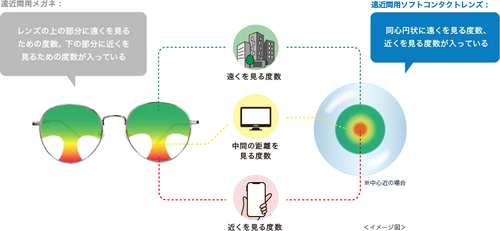 遠近両用メガネは、レンズの上の部分に遠くを見るための度数、下の部分に近くを見るための度数が入っている。 遠近両用ソフトコンタクトレンズは、同心円状に遠くを見る度数、近くを見る度数が入っている。 -