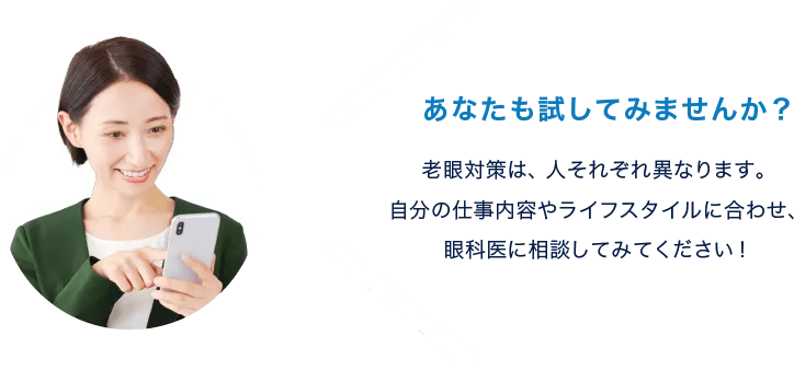 老眼対策は、人それぞれ異なります。自分の仕事内容やライフスタイルに合わせ、眼科医に相談してみてください!